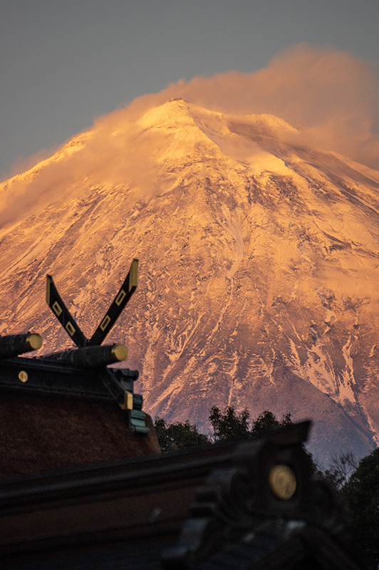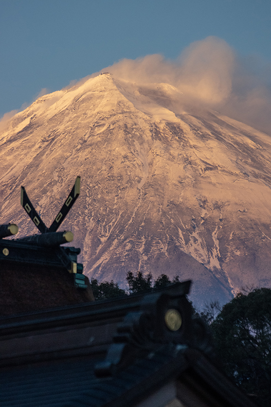 浅間大社祈祷殿前より本殿屋根越しの富士山