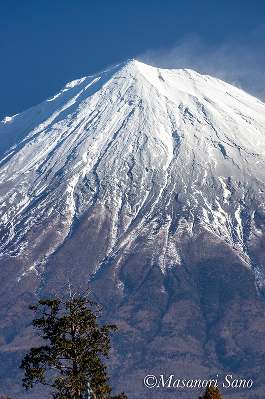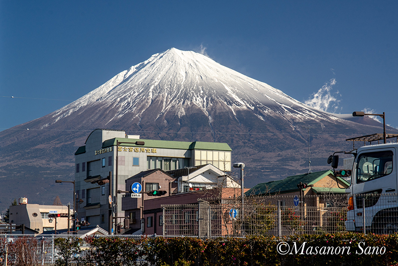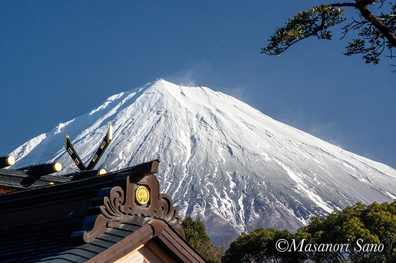 2月1日には化粧直ししたのですが、谷筋には雪が残る物の尾根周囲が露出した富士山です。 2019.2.3 節分祭の浅間大社祈祷殿前から